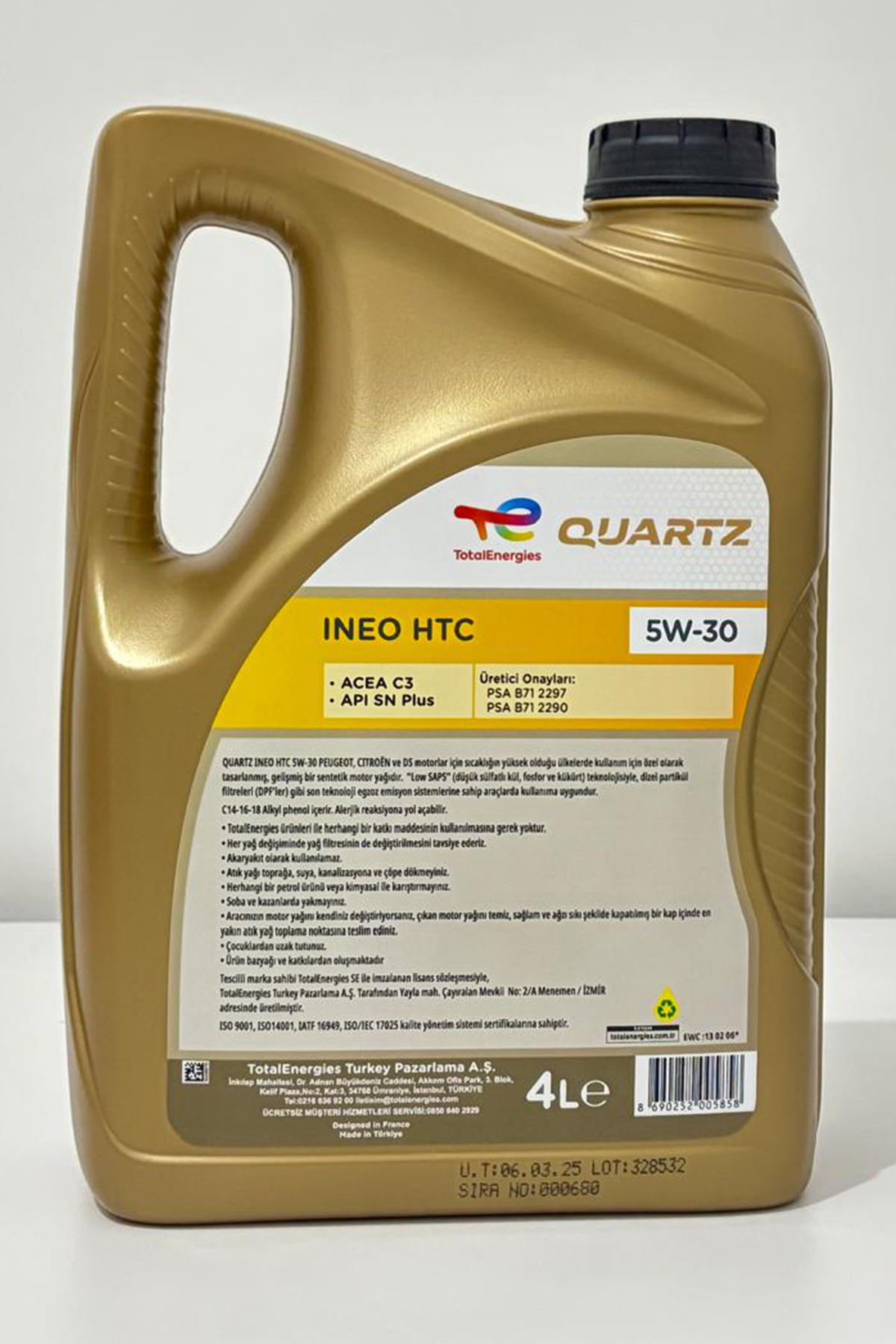 Aracınızın motor ömrünü uzatmak ve yakıt tasarrufu sağlamak istiyorsanız, TOTAL QUARTZ INEO HTC 5W30 4 LT motor yağı mükemmel bir tercih olacaktır. Yüksek performansı, çevre dostu özellikleri ve yakıt ekonomisi ile hem aracınıza hem de bütçenize katkı sağlar. Hem benzinli hem de dizel motorlar için uygun olması, onu çok yönlü bir motor yağı haline getirir.